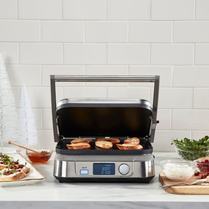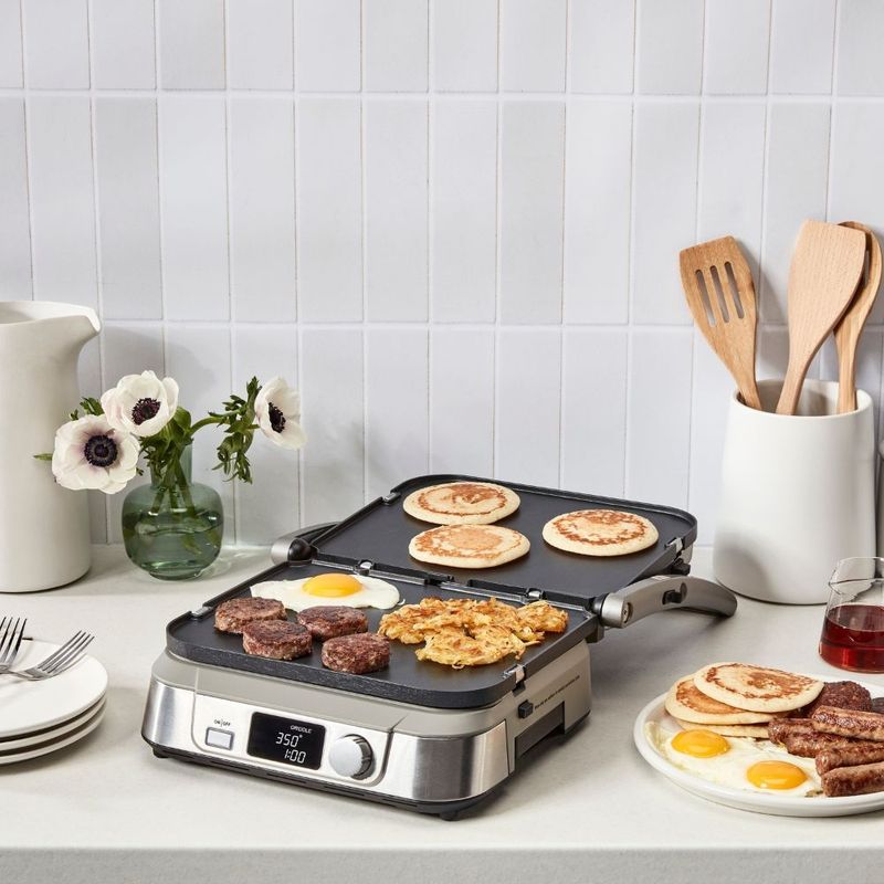 A versatilidade do Griddler Cuisinart – versão digital oferece 5 modos e layouts de uso, permitindo total liberdade no preparo dos mais variados alimentos: Grill Fechado, Panini Press, Aberto com placa grelha dos dois lados, Aberto com chapa lisa dos dois lados e Aberto com a combinação de chapa lisa e placa grelha, uma em cada lado.