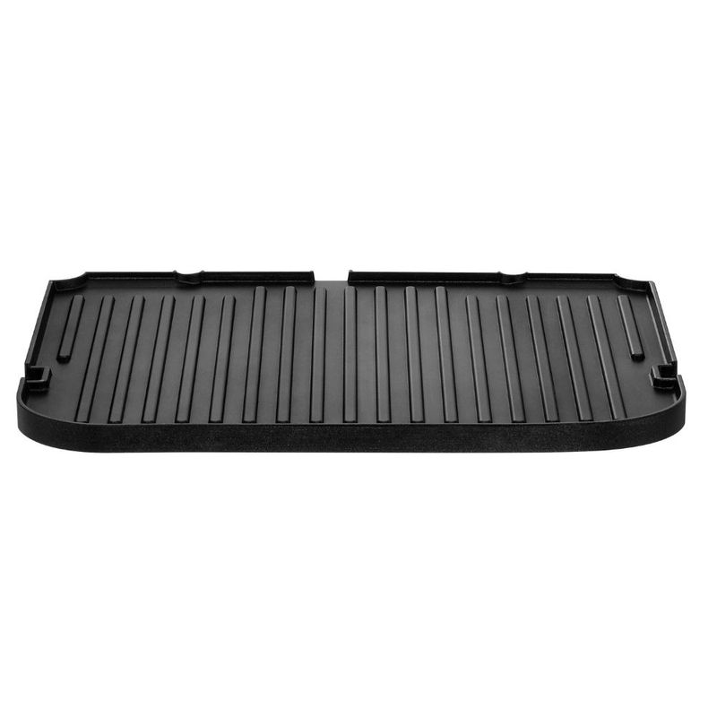 As placas são revestidas com material antiaderente, reversíveis e removíveis, cada uma medindo 28 x 23 cm, proporcionando praticidade no manuseio e na limpeza. O design das placas permite a drenagem da gordura e do excesso de líquidos, que são direcionados para o coletor integrado ao corpo do produto, garantindo preparos mais saudáveis.