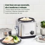 bandeja de vapor em aço inox permite preparar acompanhamentos ou frutos do mar simultaneamente ao arroz, garantindo mais sabor e praticidade no dia a dia.
